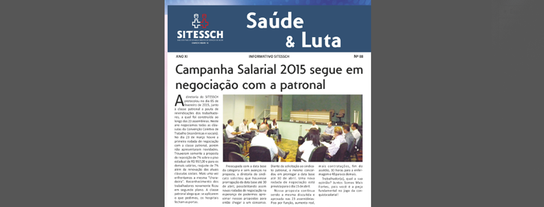 Informativo do Sindicato dos Trabalhadores em Estabelecimentos de Serviços de Saúde de Chapecó tem como tema principal a negociação da convenção coletiva de 2015, cuja data-base é em abril. A edição é do trimestre de abril a junho.