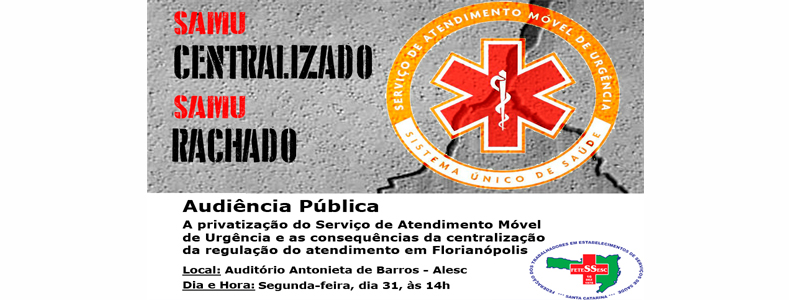 A centralização e a privatização do SAMU vão estar em pauta na Assembleia Legislativa de Santa Catarina, na próxima segunda-feira, dia 31. A Fetessesc convida a categoria a marcar presença no Auditório Antonieta de Barros, a partir das 14h, para debater as consequências das manobras econômicas do governo que estão precarizando o Serviço de Atendimento Móvel de Urgência. A audiência pública foi marcada pela deputada Ana Paula Lima e o deputado Cleiton Salvaro, representantes da Comissão de Saúde da Alesc. Entre os convidados estarão prefeitos, secretários municipais em saúde e demais autoridades envolvidas com o Samu no Estado.