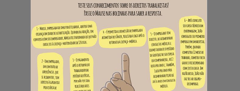 Leia as sete situações abaixo e teste  seus conhecimentos sobre os direitos trabalhistas. Para conferir passe o mouse nas bolinhas para saber a resposta.