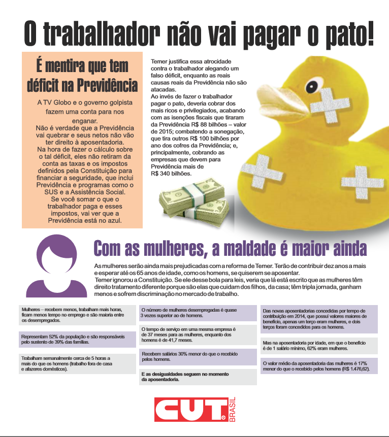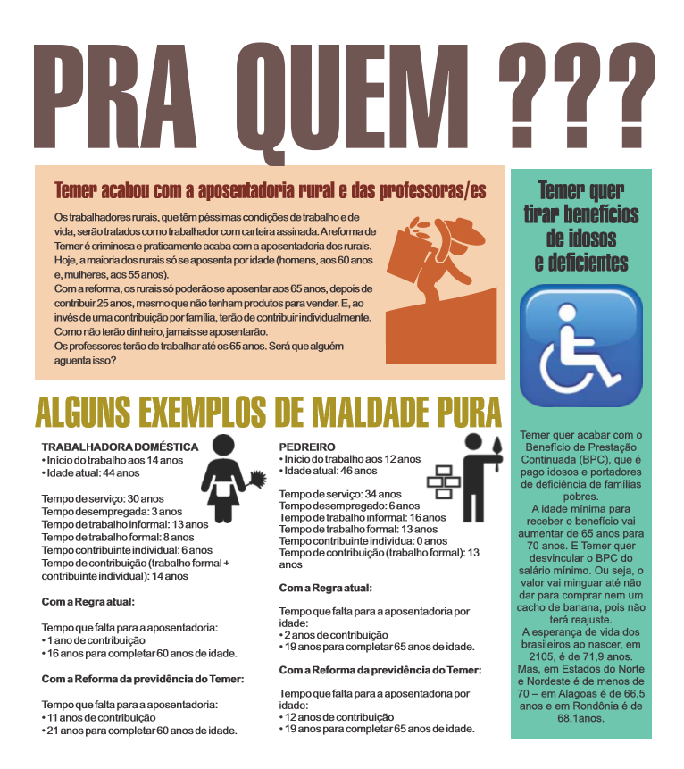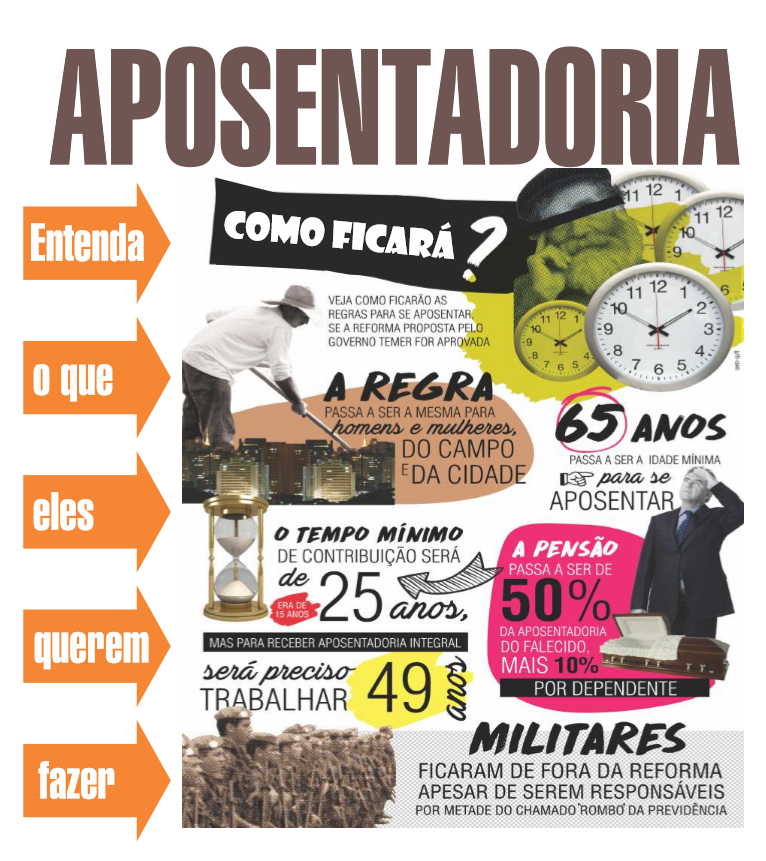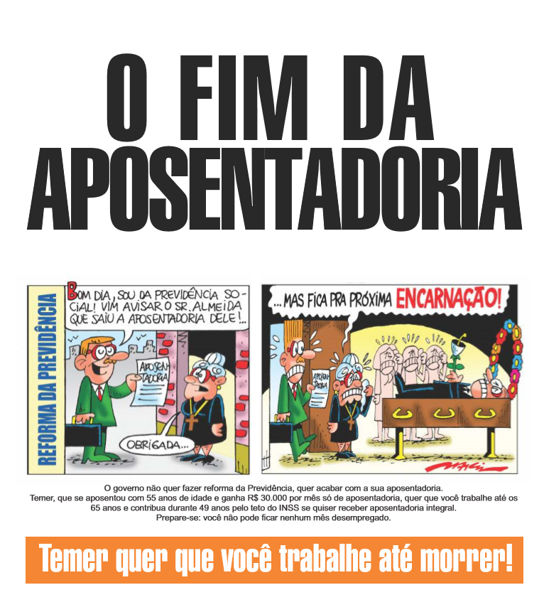 O jornal ” O fim da aposentadoria” é didático e traz exemplos da maldade que Temer e sua equipe querem aprovar já em 2017. O texto mostra como o ficará a situação das trabalhadoras domésticas, dos pedreiros, do trabalhador rural e dos demais trabalhadores.