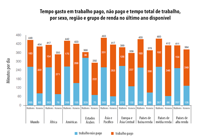 Além disso, o relatório descreve como as mulheres realizam três quartos do trabalho de cuidado não pago no mundo ou 76,2% das horas de trabalho gastas com essa atividade. Segundo o documento, mulheres gastam em média 3,2 vezes mais tempo que homens com trabalho de cuidado não pago. Ao longo de um ano, as 4 horas e 25 minutos diárias das mulheres somam 201 dias de trabalho de 8 horas e as 1 hora e 23 minutos diários dos homens somam 63 dias de trabalho nos mesmos termos.