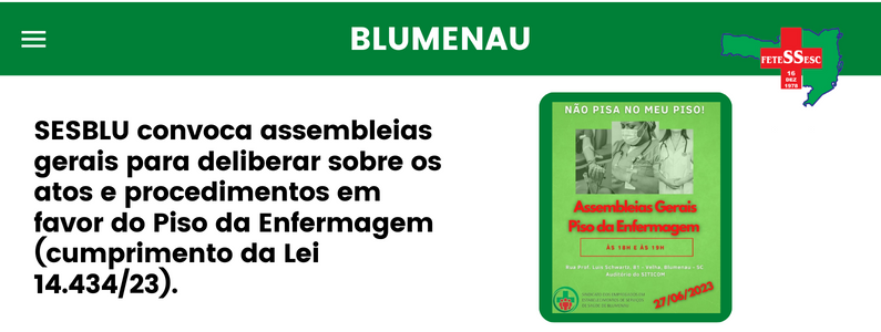 Segue convocação de todos os Profissionais da Enfermagem para participarem das Assembleias Gerais do SESBLU – Sindicato dos Empregados na Saúde de Blumenau e Região – que serão realizadas no próximo dia 27/06/23 à s 18h e à s 19h na Rua Professor LuÃs Schwartz, 81 – bairro Velha – Blumenau-SC (auditório do SITICOM) localizado entre a Vila Germânica e o Angeloni.