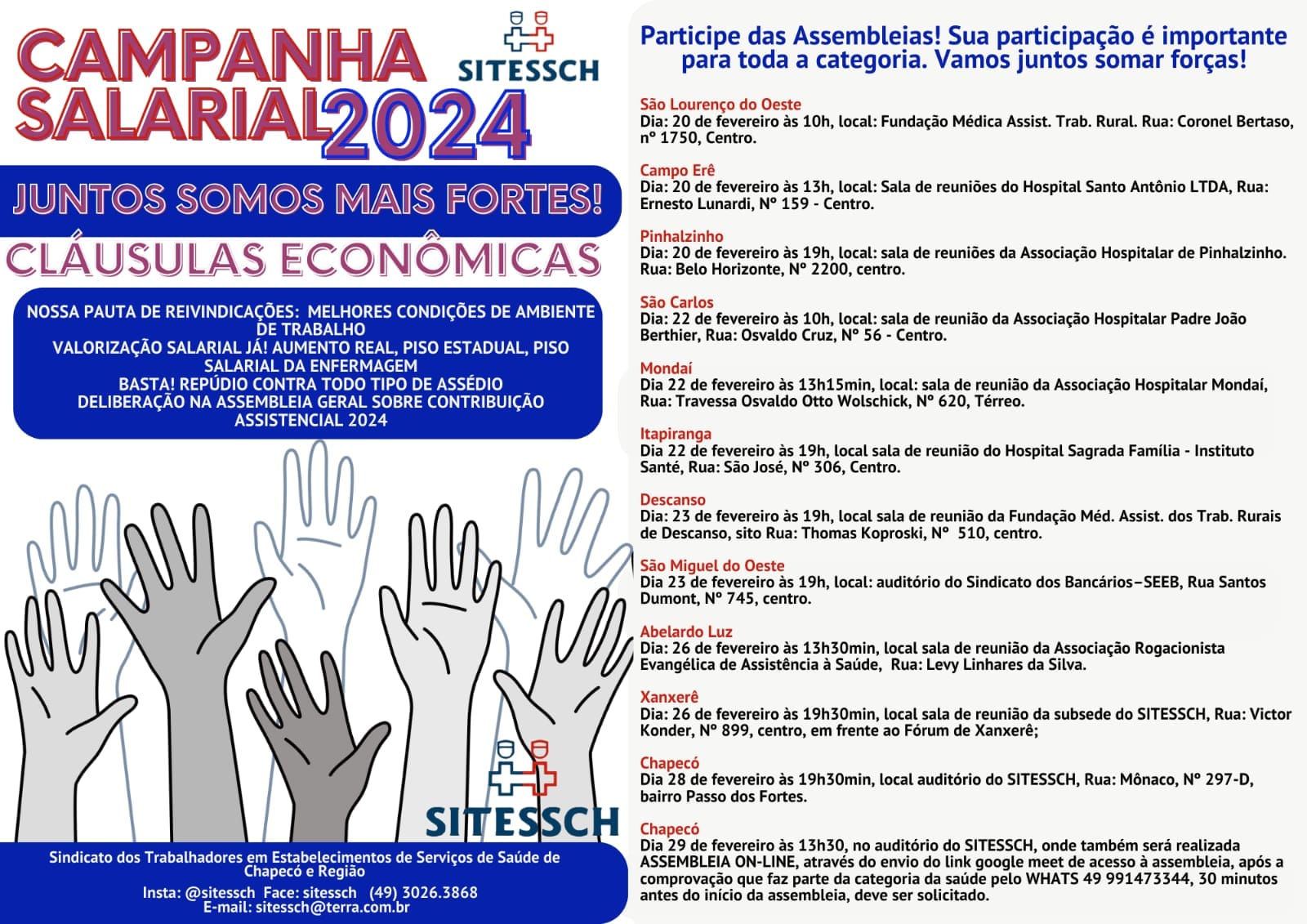 Trabalhadores da saúde e região de Chapecó e região participem das Assembleias da Campanha Salarial 2024. Some forças ao seu Sindicato nesta luta por uma remuneração salarial mais justa para toda a categoria.